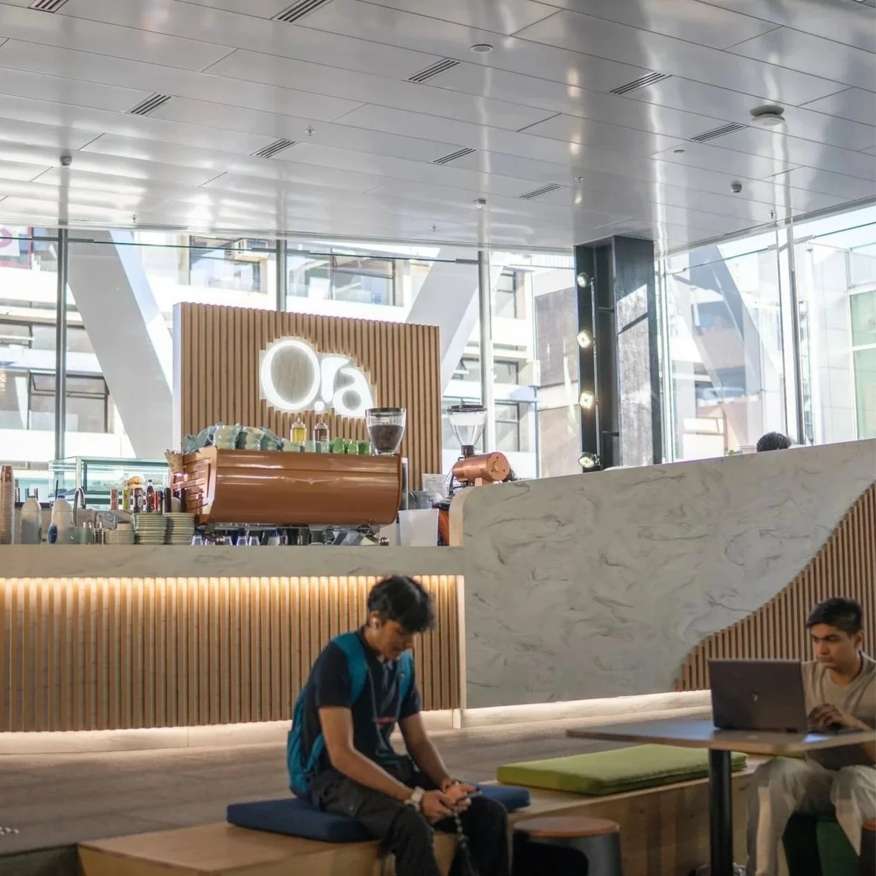 The logo design builds on these ideas, weaving cultural meaning with visual harmony: The “R” and “A” interplay like yin and yang, symbolising the balance of fitness and wellness. Food and energy, body and mind, each depend on and support the other, creating a state of flow. Circular elements in the logo embody balance and connection. The large “O” represents the main Ora Café, while the smaller circle nods to Little Ora, its smaller counterpart on-site.